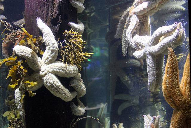 Spiny starfish are common on the rocky shores of the Western Cape. They are usually orange or blue-grey in colour. Starfish are fascinating sea creatures and you will find a multitude of them at the Aquarium.