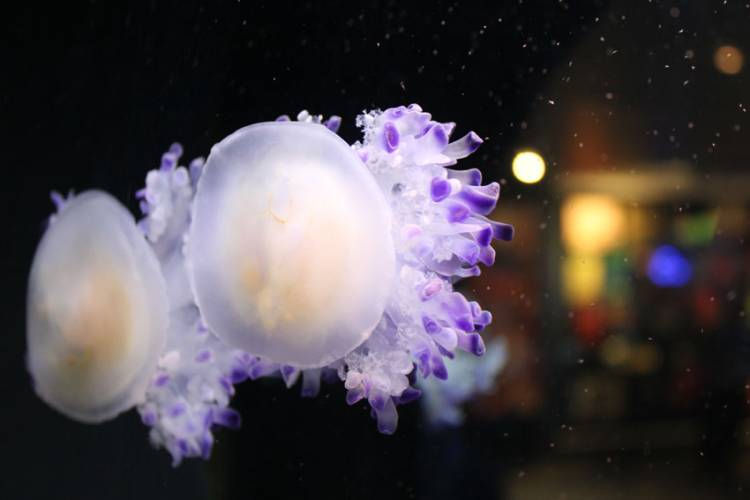 Jellyfish come in all shapes and sizes – the ones pictured here have taken perch on the side of the glass of their exhibit.