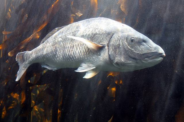 White steenbras will enter extremely shallow water, and they are often seen feeding in estuaries with their tails right out of the water.