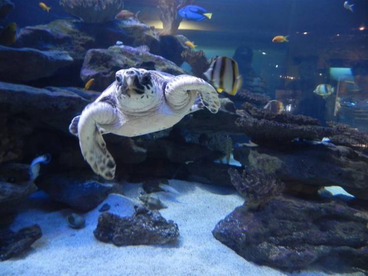This little loggerhead turtle can be seen in one of the first exhibits you encounter during a visit to the Aquarium. It’s a juvenile, and here it’s swimming along with some fishy friends including the South African butterflyfish and the regal tang (better known as Dory from Finding Nemo). Photo courtesy nullifier.