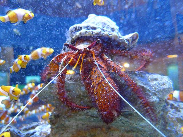 Our giant red hermit crab is a looker! Its vivid, red body makes quite the impression among the cute clownfish. Photo courtesy 57 varieties.