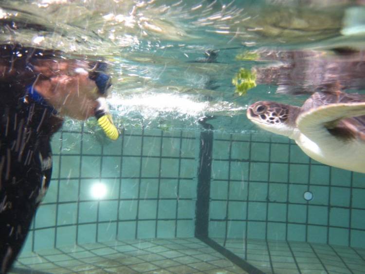 Say hello to Cannelloni, a green sea turtle currently being trained so that she can join the other creatures in our I&J Predator Exhibit. She likes being petted! Photo courtesy Katja Rock.