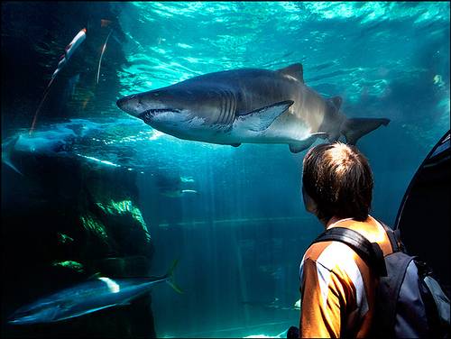 A magnificent ragged-tooth shark floats past in the I&J Predator Exhibit. Photo courtesy Day Is Coming.