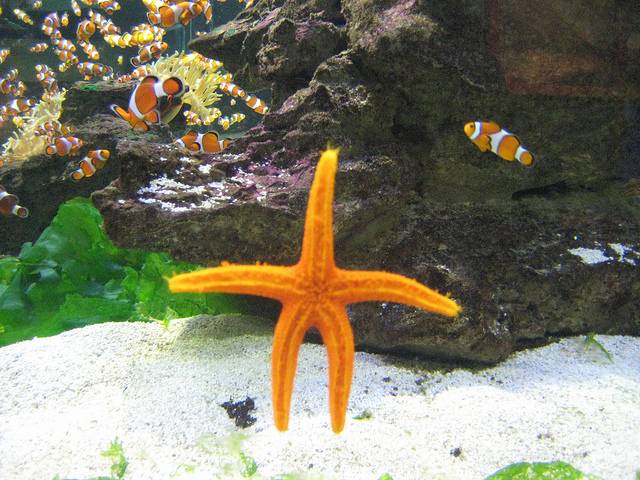 A starfish shows off its own bright orange hue among colourful anemonefish. Photo courtesy Raviashish.