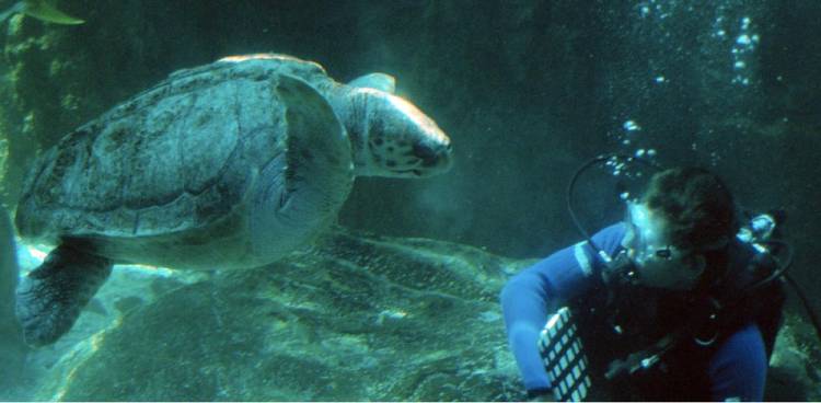 This is Yoshi, our huge (120kg) loggerhead turtle in the I&J Predator Exhibit, during feeding time. She loves her food ... a lot! Photo courtesy Katja Rock.
