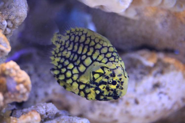 The pineapplefish is also armoured, with thick spiked plates called scutes which resemble (you guessed it) pineapples! Its fins are also equipped with spines, and it is able to lock some of these in position when threatened to give a nasty surprise to any fish trying to strike it from behind.