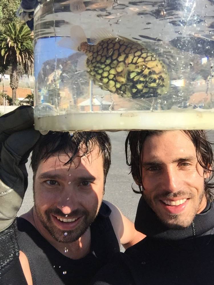 While on a routine collections dive near Long Beach, Simon’s Town, Senior Aquarist Paul van Nimwegen spotted the lone pineapplefish. The pineapplefish is not one typically collected by the Aquarium (for obvious reasons), but Paul knew that this fish needs warmer waters to survive and was out of place in the cold waters of False Bay. With winter approaching, and water temperatures bound to drop further, this little fish had a little chance of survival in the wild.
