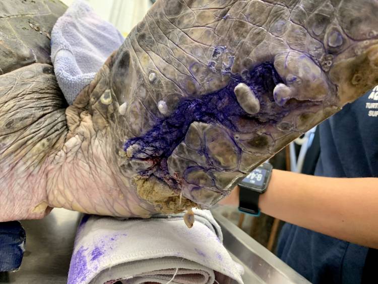 Her remaining front flipper was injured, with what the team suspect was a predator bite wound on its underside, possibly by a small shark. This injury was infected, and Geri's wound needed to be debrided, and treatment of antibiotics, fluids, vitamins and analgesics was provided. Even in the initial days after her rescue, Geri was a very active turtle and regularly managed to unbandage herself. But, the rehabilitation team persisted!