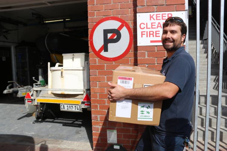 When the crabs landed in South Africa, Tinus and our collections team were ready and waiting at the airport to make sure that the crabs’ “paperwork” was in order and that there was absolutely no delay in getting them back here to the Aquarium and out of their packaging as soon and as smoothly as possible.