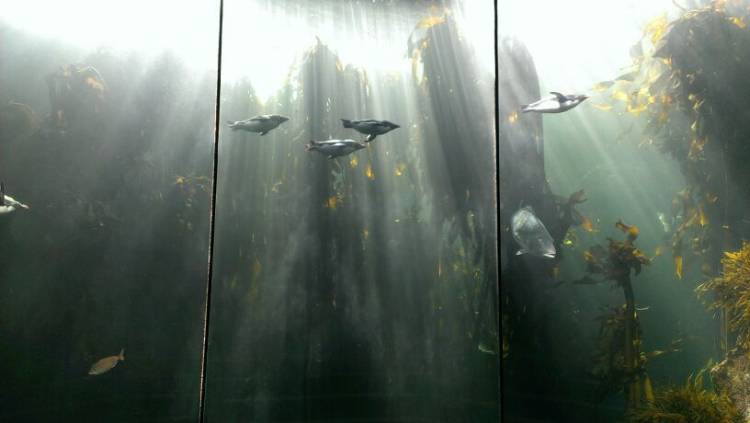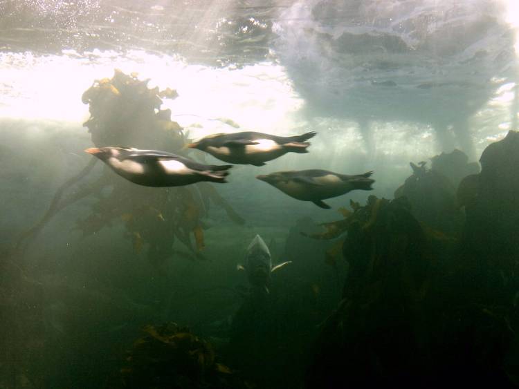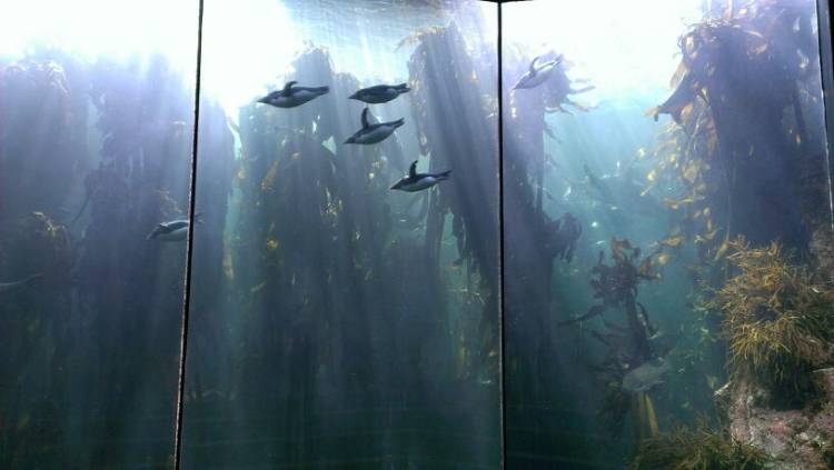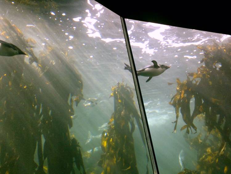 Every morning, our rockhopper penguins move from their beach in the Penguin Exhibit to their outside pool at the AfriSam Children’s Play Centre. Except on Thursdays. On Thursdays they detour past the Ocean Basket Kelp Forest Exhibit, where they spend some time swimming among the tall kelp plants and large fish.