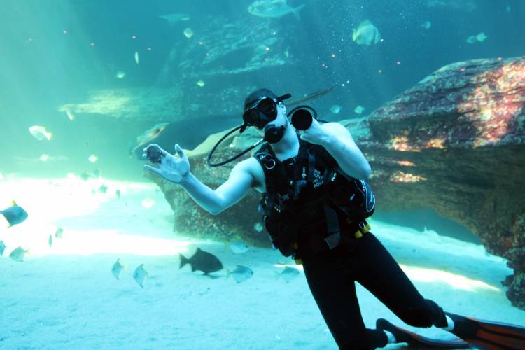 Even though public feeding time presentations are on hold, to avoid crowding inside the Aquarium, our divers will still be hard at work inside all our largest exhibits. When you spot a diver on duty, take a minute to look closely at what they are doing - feeding the animals, unusual maintenance tasks and smiling at children on the other side of the glass is all in a day's work for them!