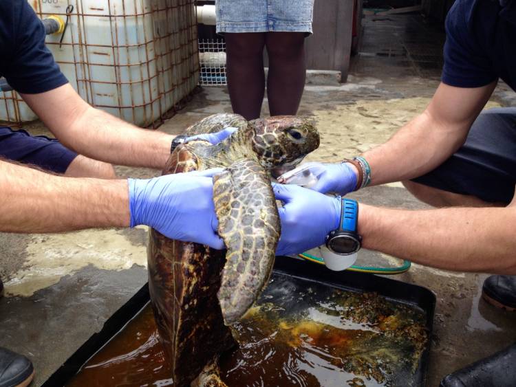 Now the turtle will rest and recuperate until our resident veterinarian Dr Georgina Cole can take blood samples, X-rays and conduct whatever other medical procedures might be needed to find out why the turtle became stranded and what its condition is right now. It could be that the turtle simply got lost, or more seriously, that it has swallowed plastic bags and balloons, like Bob, another rescued green sea turtle here at the Aquarium. There is also the possibility that the turtle might have an infection that needs to be treated.