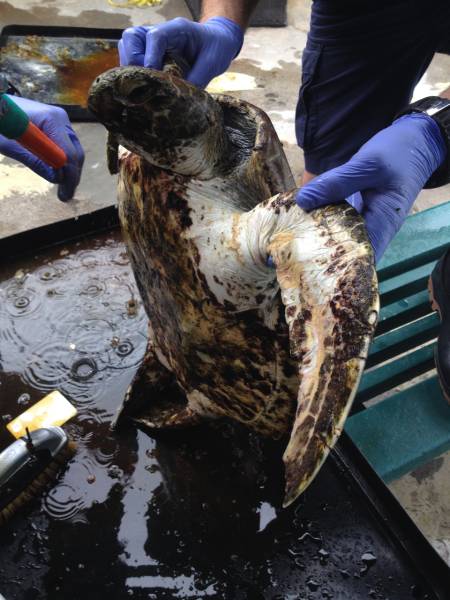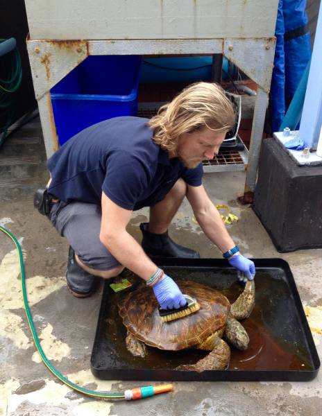 Once they arrived at the Aquarium from Struisbaai, Kevin and Nicholas gently scrubbed and scraped the turtle to get rid of the algae, and once they were done it was placed in fresh water.
