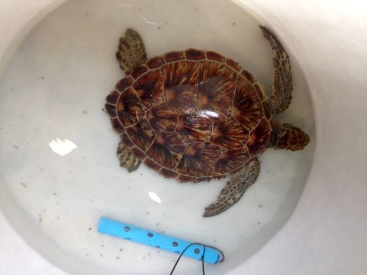 This green turtle joins three hawksbill turtles, three green turtles and an Olive Ridley along with more than 50 loggerhead hatchlings currently in quarantine and awaiting release. The turtles are monitored closely for any signs of illness or deteriorating health.