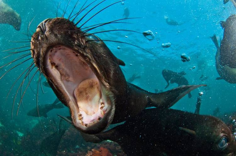 South African fur seals live only off the coasts of South Africa and Namibia and can be seen basking in the sun at various spots in the V&A Waterfront harbour. Like humans, seals are mammals and have bony skeletons, as opposed to sharks which have skeletons made of cartilage. Fur seal skeletons look similar to those of dogs and, like dogs, they have canines, which shows that they are carnivores.