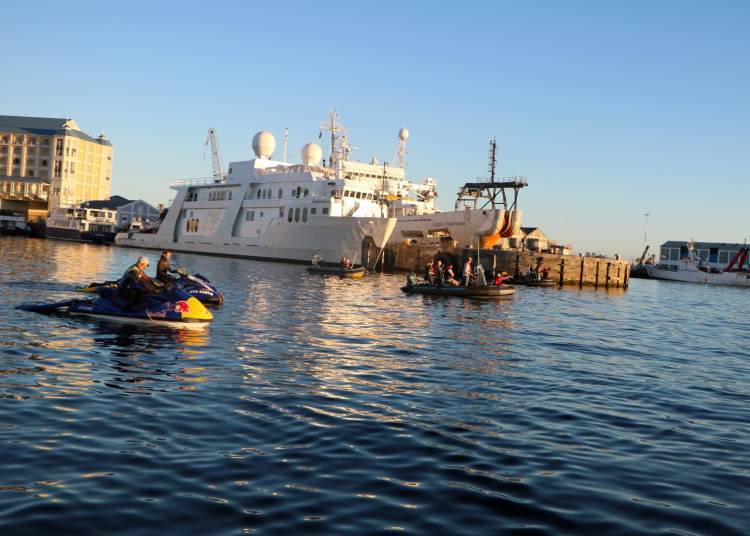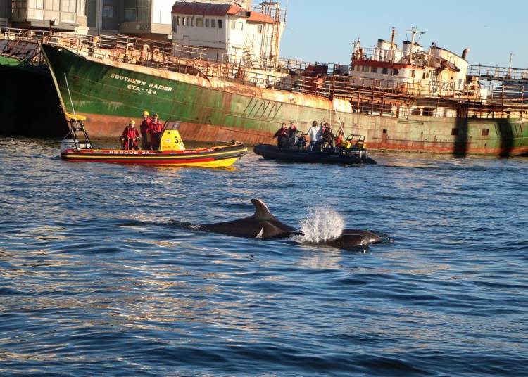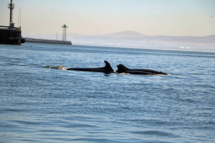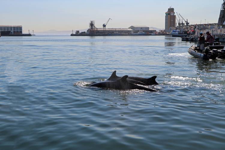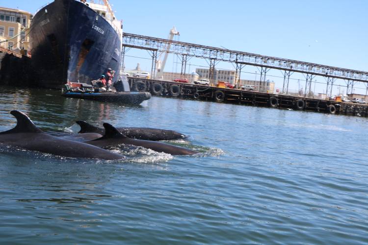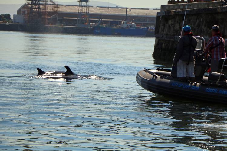Three boats were dispatched, staffed by the Aquarium, DEA and CoCT, to carry out manoeuvres to drive the false killer whales from the inner harbour, the V&A Waterfront's Alfred Basin, either out of the harbour completely or into an area with less boat activity.