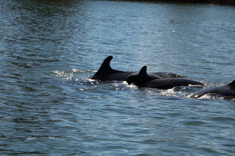 It was decided that the false killer whales were growing used to the sounds of our boat engines, and had learned that they could dive under them instead of swimming away. Instead of continuing to attempt to drive them out of the harbour, we shepherded them into the much quieter South Arm of the harbour.