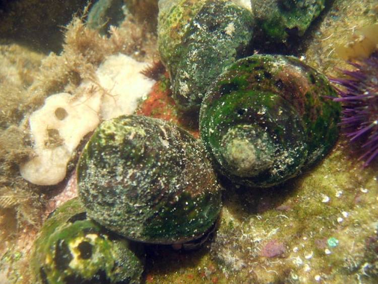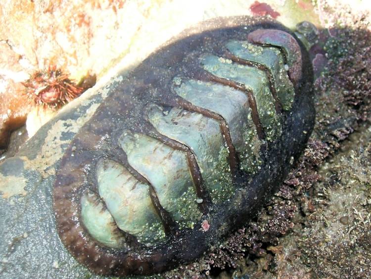 Giant chitons (Dinoplax gigas) are unusual-looking molluscs, with segmented shells that allow them to stick tightly to any curved surface (feel it - it's really tough). They hide under rocks during the day and emerge at night to eat algae and barnacles.