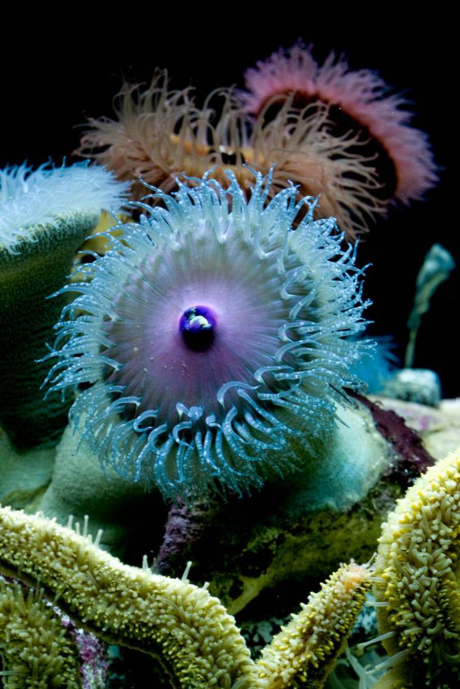 Anemones might look like flowers, but they are actually animals! They use venomous barbs on their tentacles to catch food and move it to their mouth (which is also their anus). The sandy anemone (Aulactinia reynaudi) also has tentacles, but it can't sting human hands, so it is safe to touch - very gently, please.