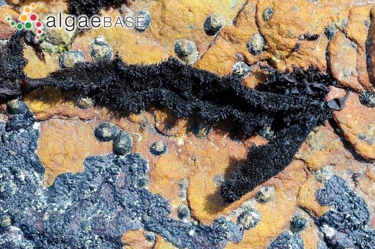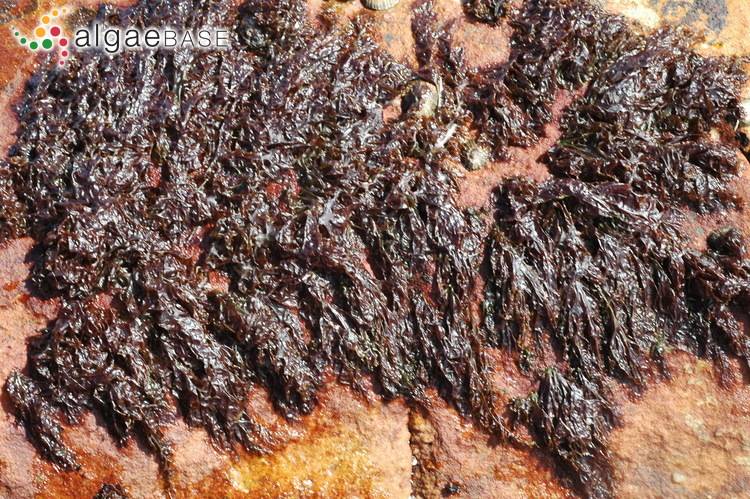 Purple laver (Porphyra capensis) looks like a purple-brown version of sea lettuce, but it has the awesome ability to survive outside of sea water for a long time without drying out. Purple laver is actually edible and you can even make yummy sushi out of it!