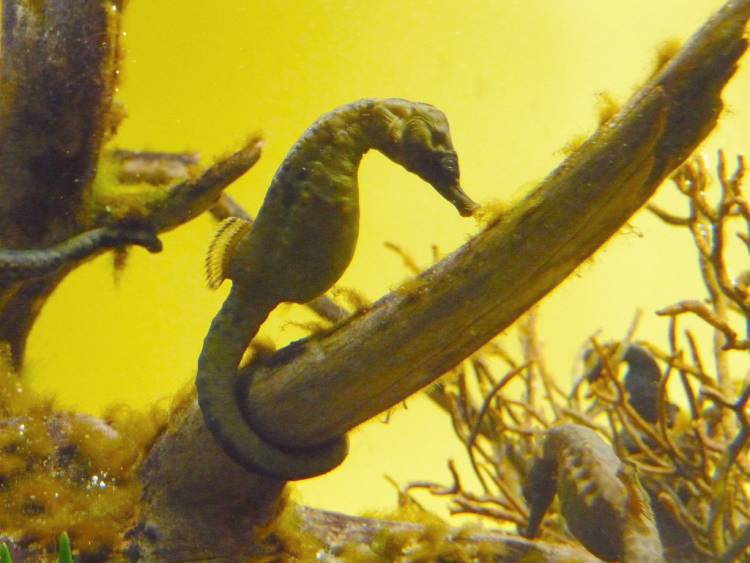 This Knysna seahorse uses its prehensile tail (meaning that the tail has adapted to be able to grasp or hold objects) to hold on to a branch in the Oceans of Contrast: Atlantic Ocean Gallery at the Two Oceans Aquarium. Seahorses are poor swimmers, and are often found resting with their tails wound around a stationary object.