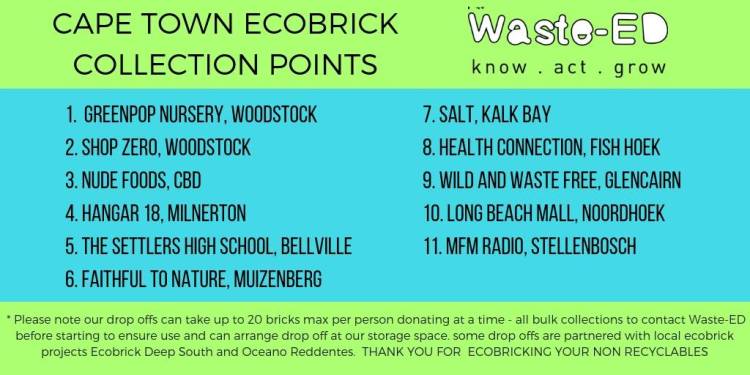 Residents of Cape Town can contribute their EcoBricks to Waste-ED, while Johannesburgers can drop theirs off with ADVA Youth Skills Development. Residents in other South African cities can contact local projects directly.