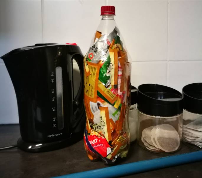 EcoBricking is simply a case of forming a habit - rather than throwing your wrapper in the bin, just stuff it into a disposable bottle that you keep next to your sink or bin. Many projects have a preferred bottle size preference so please contact any project you would like to support before you start EcoBricking. But, you can always make oddly shaped EcoBricks for personal projects. This is an easy way to make a small impact.
