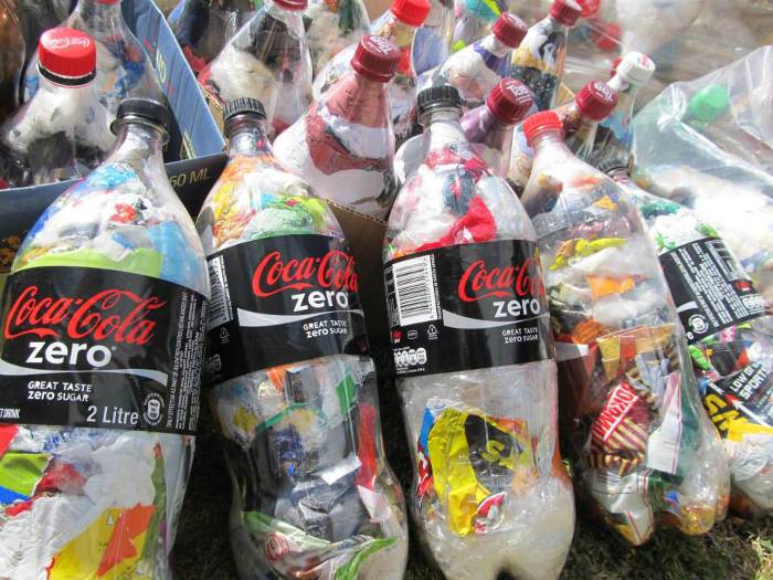 An EcoBrick is a plastic bottle packed tightly with clean and dry, non-biodegradable waste. These bottles can then be used as building materials to create insulative structures and colourful furniture.