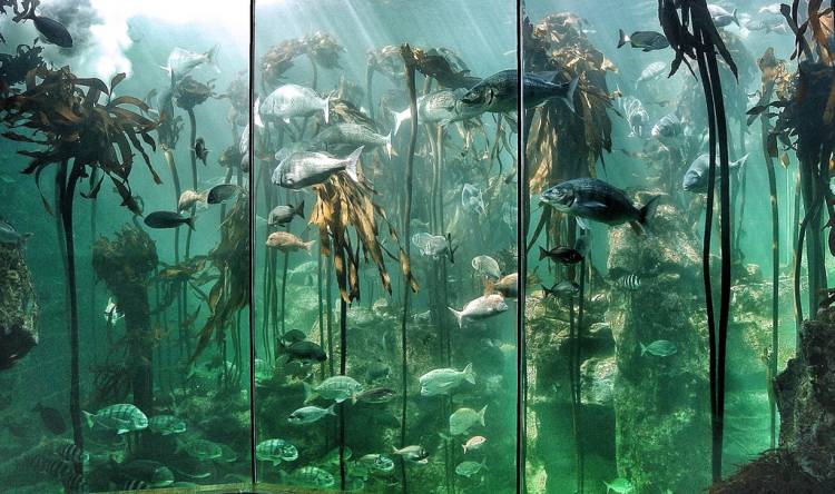 The Ocean Basket Kelp Forest Exhibit at the Two Oceans Aquarium is an underwater forest where kelp plants grow like tall trees, fish swim through the fronds like birds, and abalone, sea urchins and rock lobsters feed and take cover among the root-like holdfasts.