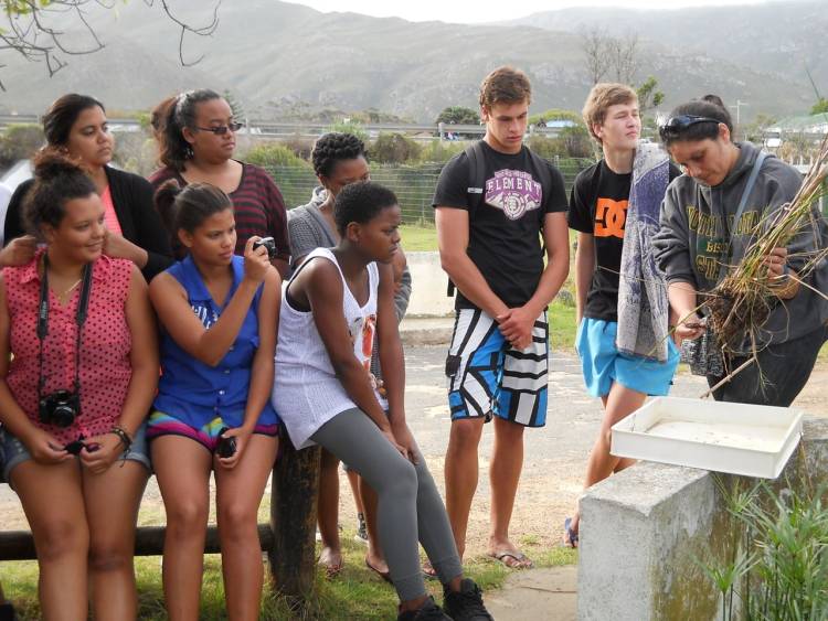 Next up was a trip to the wetland at Kleinmond’s main beach. Khonzani Lembeni, our Aquarium teacher, and Bianca Engel talked to the YBs about the importance of wetlands, the little critters that live in a wetland (yes, they are there even if you cannot see them), and the valuable role wetland plants play