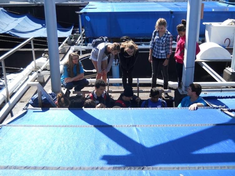 Andrew, one of our volunteers, shows the YBs our roof area, which includes the top of our kelp forest exhibit and the top of our I&J Predator Exhibit