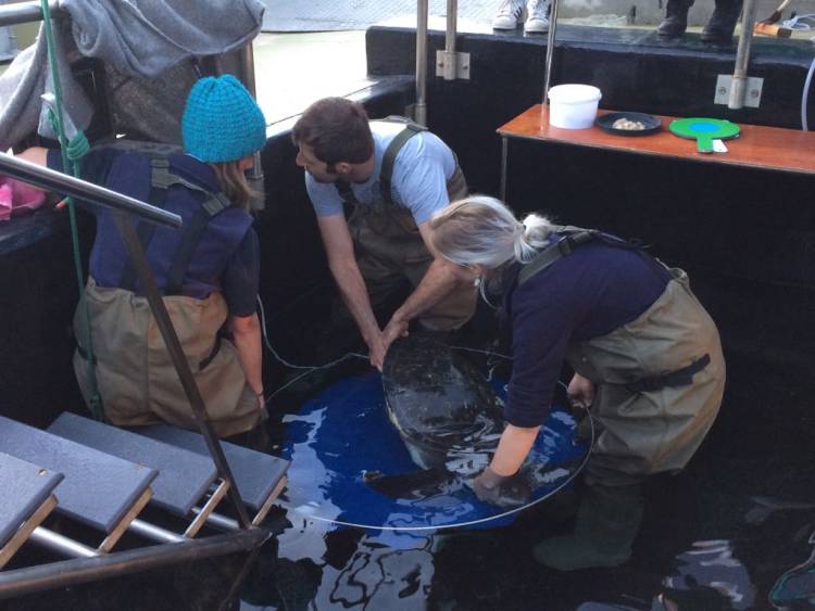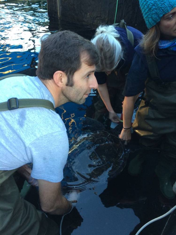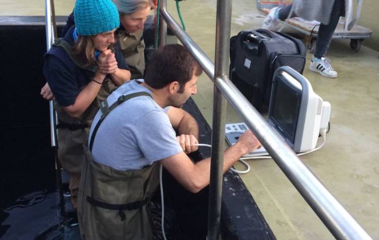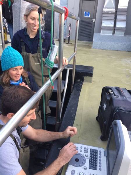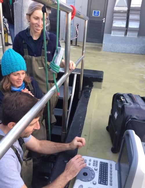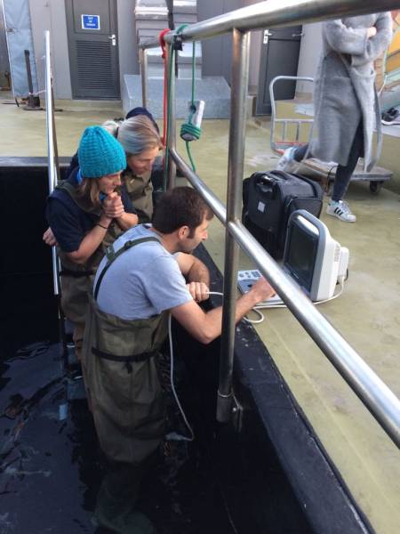 The ultrasound machine was set up next to the I&J Ocean Exhibit’s medical pool and staff climbed in to draw Bob and Sandy's attention. While the turtles were distracted by love, food and attention, their rear ends were examined using the ultrasonic probe.