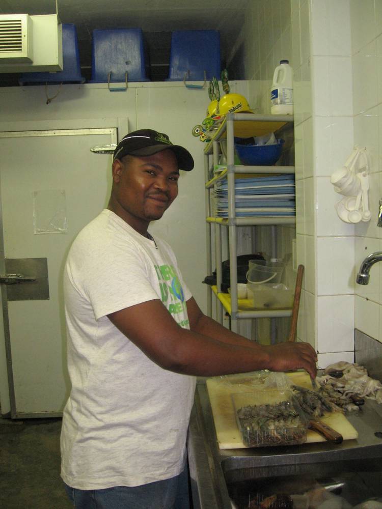 The kitchen is Xolela’s kingdom and he rules it like a good king should. Here he ensures that none of the animals in the Aquarium go hungry. That means that on Tuesdays and Thursdays, Xolela prepares 25 kilograms of food for the I&J Predator Exhibit and on Wednesdays the fish in the Kelp Forest Exhibit receive between 15 and 20 kilograms of food. This includes pilchards and squid that are chopped up in various sizes to ensure that all the fish get their fill.