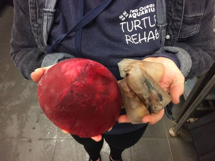 The turtle was rescued by Lambert's Bay local Dougie Leech who kept it at his home overnight, while Senior Aquarist Kevin Spiby and Collections Officer Deen Hill drove to Lamberts Bay to collect the turtle. They were able to collect the wounded turtle early the next day and return it to the Two Oceans Aquarium that afternoon - coincidentally amidst World Turtle Day festivities.
