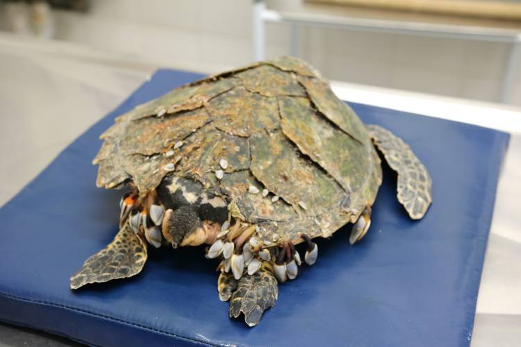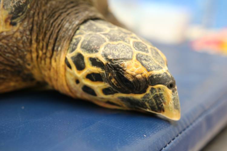 On the 22 May 2018, the Two Oceans Aquarium received a call from a member of the public who found a distressed sea turtle floating in the kelp near Lambert's Bay - immediately our aquarists and turtle rehabilitation team put plans in place to rescue this wounded animal, which was identified as a critically endangered hawksbill turtle.