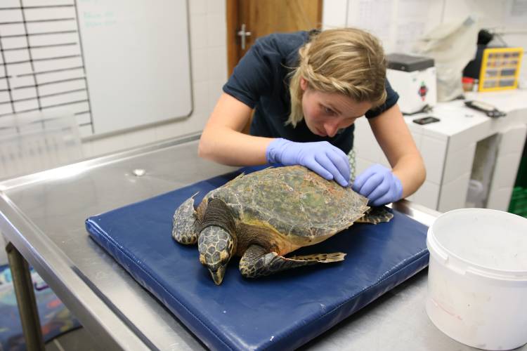 It was then time for veterinary staff to examine the turtle. A large portion of the back of its shell was missing, probably caused by a shark bite. It looked like the plates of its shell had been removed one by one - so we named her Jenga after the popular game.