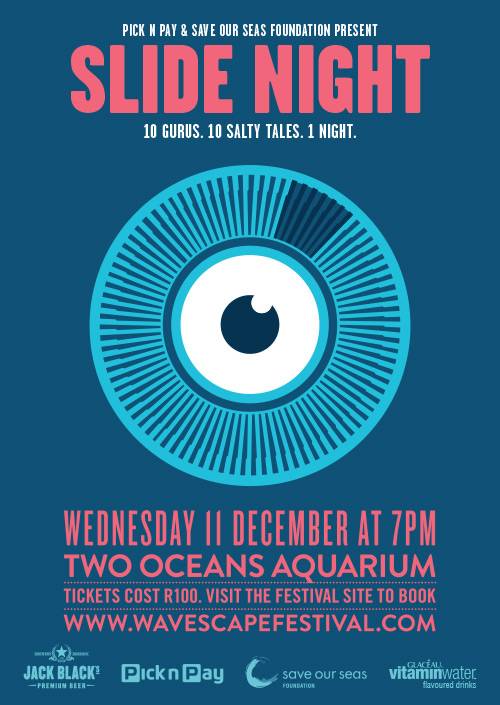 Slide Night is being hosted at the I&J Predator Exhibit at the Two Oceans Aquarium on Wednesday 11 December, and starts at 19h00. Tickets cost R100. Lauren de Vos, research assistant at the University of Cape Town’s Marine Research Institute and creator of several beautiful videos about False Bay, will be our MC. There will be delicious food and Jack Black’s craft beer on sale during the intermission. Slide Night is a very popular event with limited space, so please secure your ticket soon!