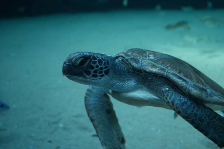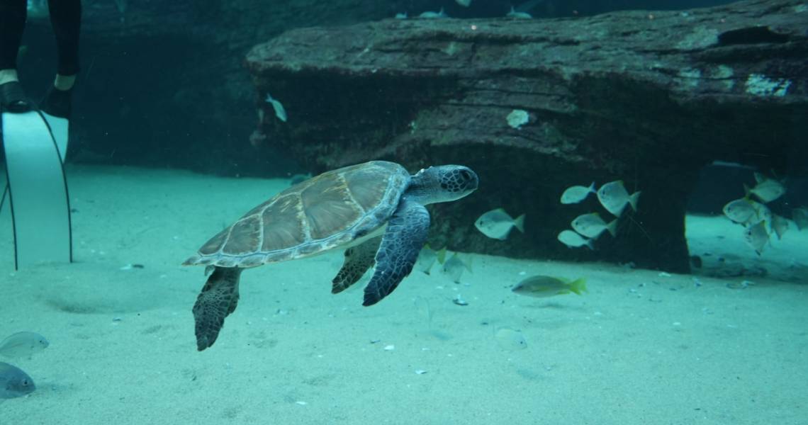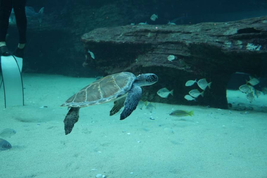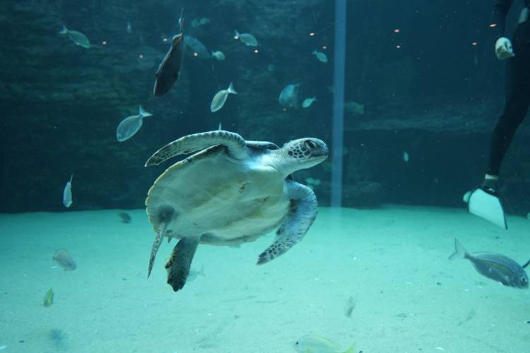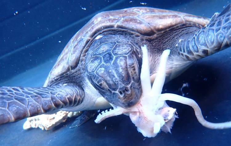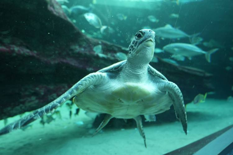 Kijani has quickly adapted to the large new space provided by the I&J Ocean Exhibit. She initially appeared unaware of what was in store for her beyond the medical pool, but she has now figured out how to adventure further out; diving, scratching against the rock work, exploring all the crevasses and overhangs. She also shows plenty of curiosity for the other two long-term rehabilitation turtles in I&J Ocean Exhibit – Bob and Turbo.