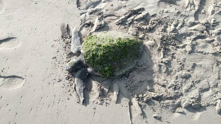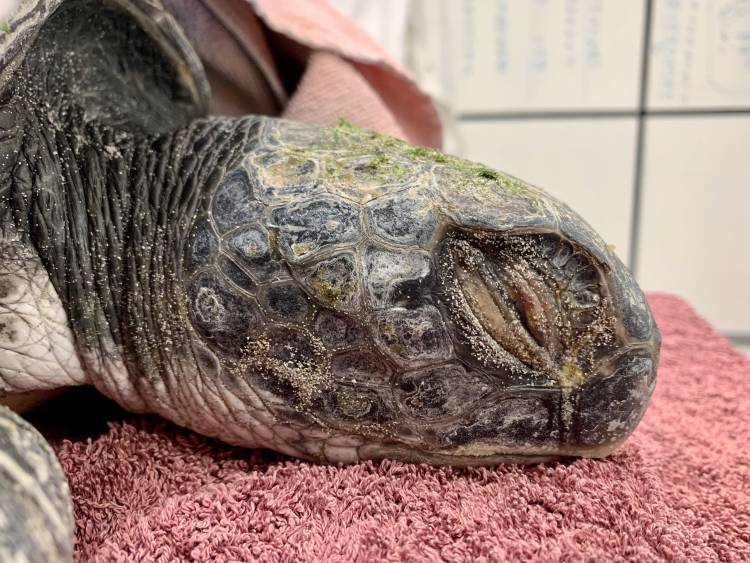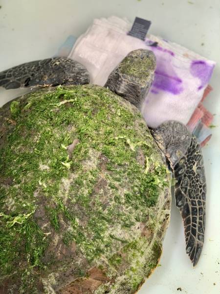 Named “Kijani” by the rehab team (meaning “green” in Swahili), this turtle was discovered by Spilltech, one of our Turtle Rescue Network partners, high up on the sandy beach, in very poor body condition, very thin, and with over 50% algal coverage. These factors suggest Kijani had been struggling for a long time. Kijani was safely moved off the beach and transported to the turtle hospital at the Two Oceans Aquarium where she was admitted by our own team members Tracy Whitehead and Martine Viljoen.