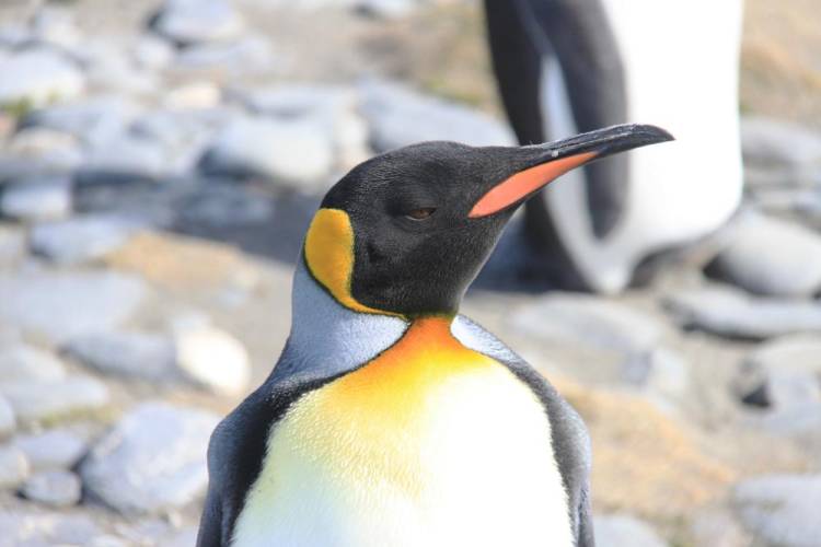 This image shows the beautiful blue but subtle outline of the king penguin’s beak, as well as the emerald green collar, equally subtle, between the black neck and orange chest.