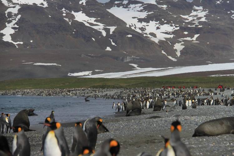 Salisbury Plain lies between the mouths of glaciers Grace and Lucas on the north coast of South Georgia – a remote but breathtakingly beautiful part of the world. Here, about 60 000 king penguin breeding pairs are left to do their thing. The red dots in the background are the members of the expedition crew with whom Sinclair travelled (and not some unidentified walking object).
