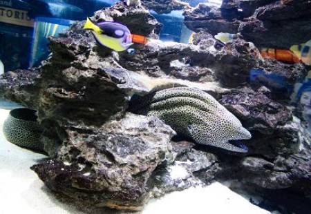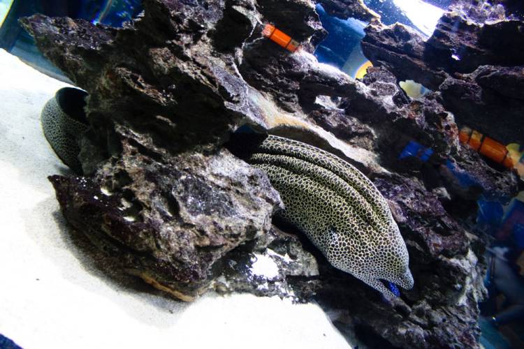 We have four species of moray eel in the Aquarium and they can all be seen in the Indian Ocean Gallery. They are the very large honeycomb moray eel, the beautifully patterned geometric moray eel, the aptly named zebra eel and the very similar looking tiger reef eel.