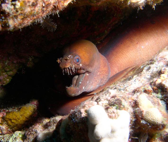 The scariest looking (and this is completely my personal opinion) must be the viper moray eel. With a face that only a mother could love, this eel is not improving the eel image one bit.