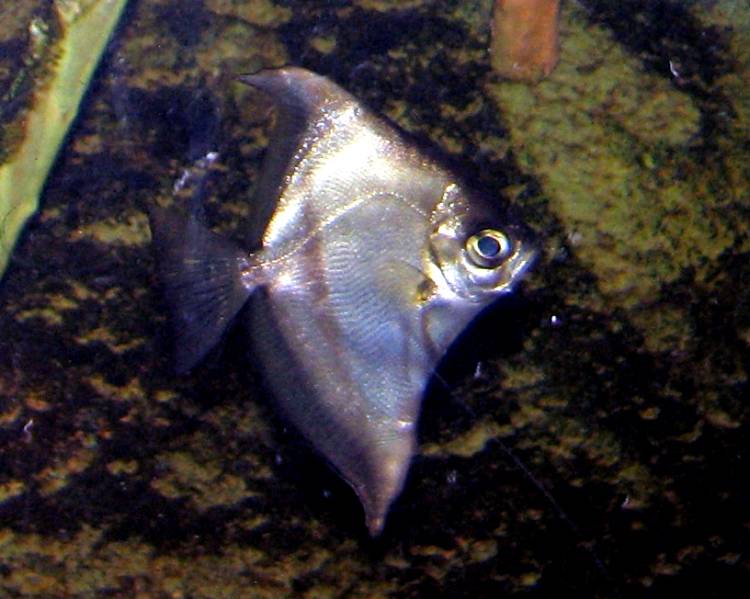 The Natal moony (Monodactylus argenteus) is a much more widely distributed fish. It also has way more common names, probably because it lives in many different waters. The Natal moony is also called the silver moony, round moony, silver batfish, diamond fish, butter fish and butter bream. The meaning of its species name, argenteus, is silver, so silver moony is the most accurate.