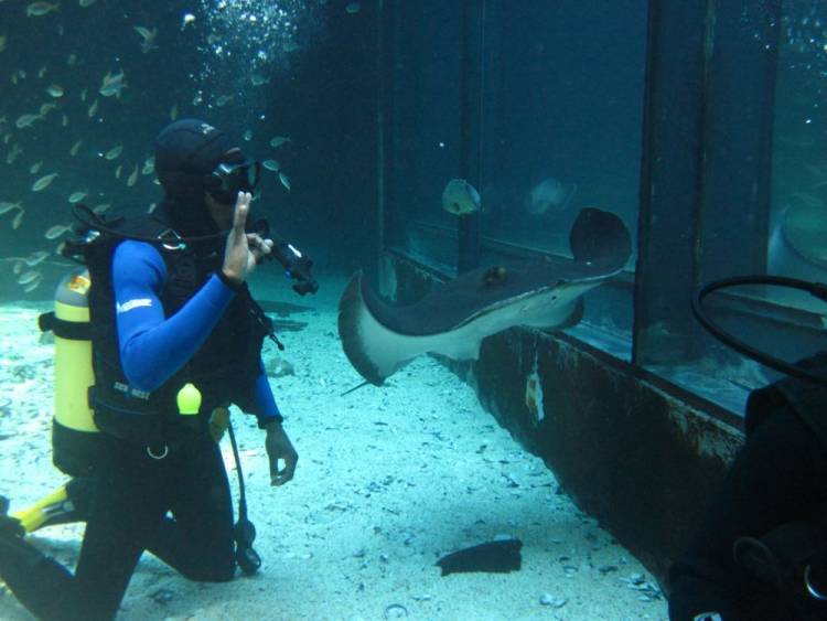 Msa has been with the Aquarium for six years. His job involves interacting with and assisting Aquarium visitors on a daily basis, and booking shark dives for them.