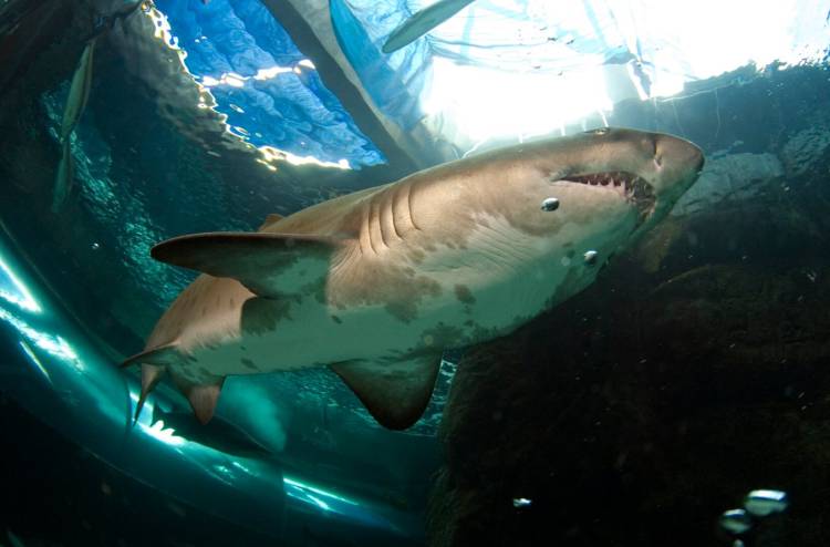 The caudal (tail) fin is primarily used to propel fish through the water. There are different shapes of caudal fins. These shapes include round, square, forked, lunate, pointed and indented. The shape of the caudal fin is often an indication of how fast a fish tends to move. A rounded caudal fin indicates a slow-moving fish, like the giant kob in the Predator Exhibit, or the black musselcracker in the I&J Ocean Exhibit. A lunate, or arrow-shaped fin indicates a fast-moving fish, like the yellowtail in the Predator Exhibit.
