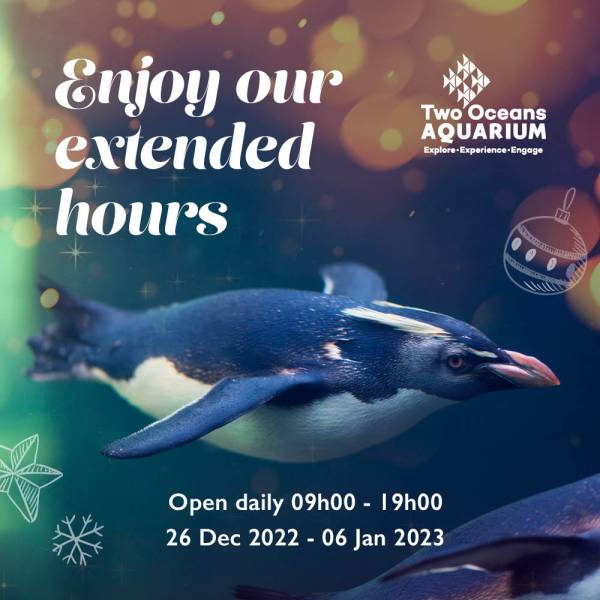 From 26 December 2022 to 6 January 2023, the Aquarium will be open for longer - from 09h00 and closing only at 19h00!