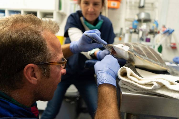 Upon arrival at the rehabilitation centre, Marcel was given basic stabilising care and his wounds were inspected. Unfortunately, his back flipper, where the net had wrapped around him, had had its blood flow completely blocked off and was entirely gangrenous. Two Oceans Aquarium veterinarian Dr Brandon Spolander, together with the conservation team of the Foundation, immediately set about to amputate the necrotic flipper - something that was necessary if this turtle was going to survive.