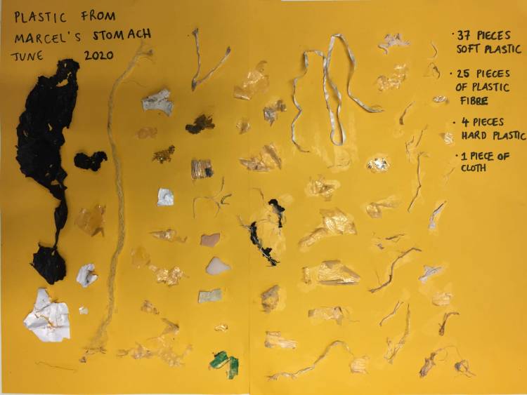 This autopsy also revealed another sad problem - Marcel's stomach contained 67 pieces of plastic - bits of hard microplastic, pieces of rope, clothing fibres and plastic shopping bag fragments. Although ingested plastic was not the cause of death in the case of Marcel, the sheer quantity of plastic we found was alarming. These must have been fragments of plastic that he had consumed along the South African coastline before becoming entangled in the ghost fishing net.