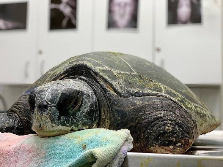 A 48kg Geri was rescued on 25 July 2021 at Paternoster - an unusual location for green turtle strandings! She was clearly missing her front left flipper, which appeared to be an old injury, but also had serious injuries and infections which hampered the movement of her remaining right flipper. Lacerations on her right flipper were deep enough to expose bone, definitely a cause for concern!